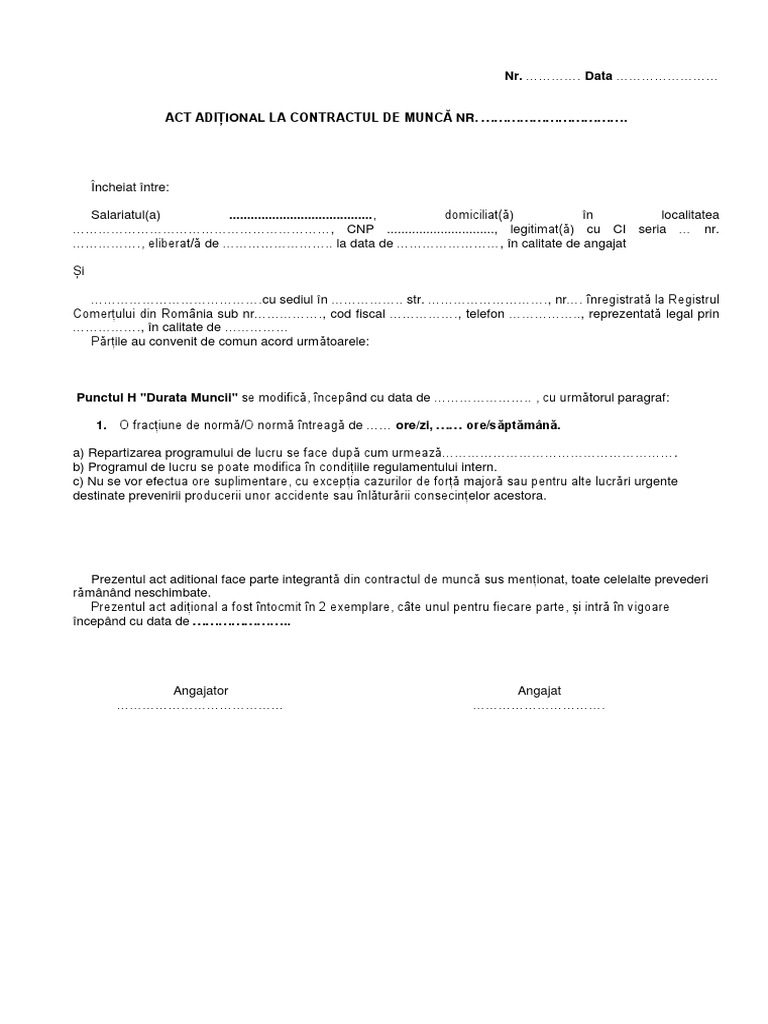 Act aditional modificare program de lucru. 113 din codul muncii repartizarea timpului de munca in cadrul saptamanii este de regula uniforma de 8 ore pe zi timp de 5 zile cu doua zile de repaus. Dacă continui să folosești acest site web ești de acord cu utilizarea lor. Modificarile care intervin la cim se fac doar cu act aditional la cim care se inregistreaza la itm. Programul de lucru este stabilit de fiecare angajator si este inclus in regulamentul intern si afisat la intrarea in unitate.