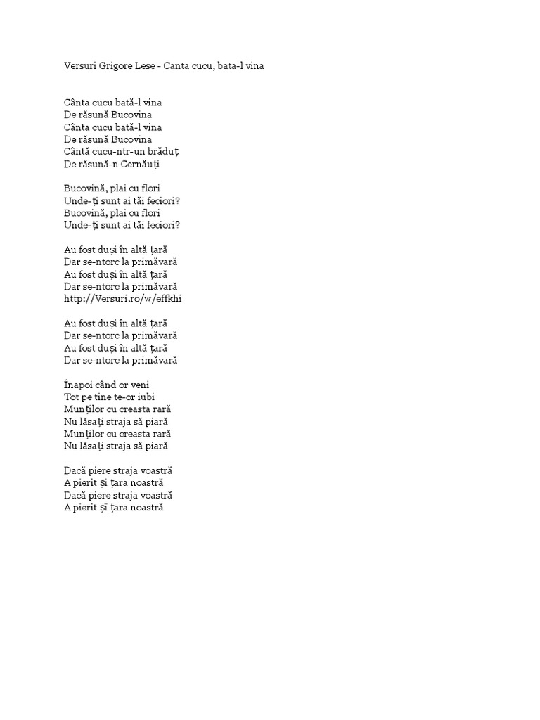 In muntenia canta cucul de rasuna n vale nucul mai mai. Cântă cucu bată l vina cântă cucu bată l vina de răsună bucovina da cântă cucu bată l vina de răsună bucovina cântă cucu ntru n brăduţ de răsună n cernăuţi măi cântă cucu ntru n brăduţ de răsună n rădăuţi măi munţilor cu creasta rară nu lăsa straja să piară da munţilor cu creasta rară nu lăsa straja să piară că de piere straja voastră va pieri şi ţara noastră că de. Canta cucul cu muntenii ii raspund frumos oltenii. Versuri canta cucu bata l vina de grigore lese.