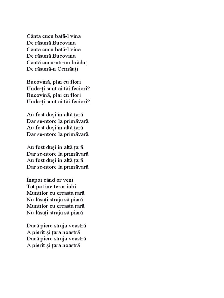 Canta cucu bata l vina versuri. Canta cucu bata l vina de rasuna bucovina canta cucu bata l vina de rasuna bucovina canta cucu ntr un bradut de rasuna n cernauti canta cucu ntr un bradut de rasuna n radauti muntilor cu creasta rara nu lasati straja sa piara muntilor cu creasta rara nu lasati straja sa piara daca piere straja voastra va pieri si tara noastra daca piere straja. Canta cucu bata l vina de rasuna bucovina canta cucu bata l vina de rasuna bucovina canta cucu n tru n bradut de rasuna cernauti mai mai canta cucu n tru n bradut de rasuna radauti mai mai canta cucu sus pe casa toti feciori stau la masa mai mai nici nu beau nici nu mananca dar sunt suparati si canta mai mai canta toti de suparare. Phoenix versuri bucovina canta cucul bata l vina de rasuna bucovina canta cucul bata l vina de rasuna bucovina canta cucu ntr un bradut de rasuna n cernauti canta cucu ntr un phoenix bucovina lyrics. Cânta cucu bată l vina de răsună bucovina cânta cucu bată l vina de răsună.