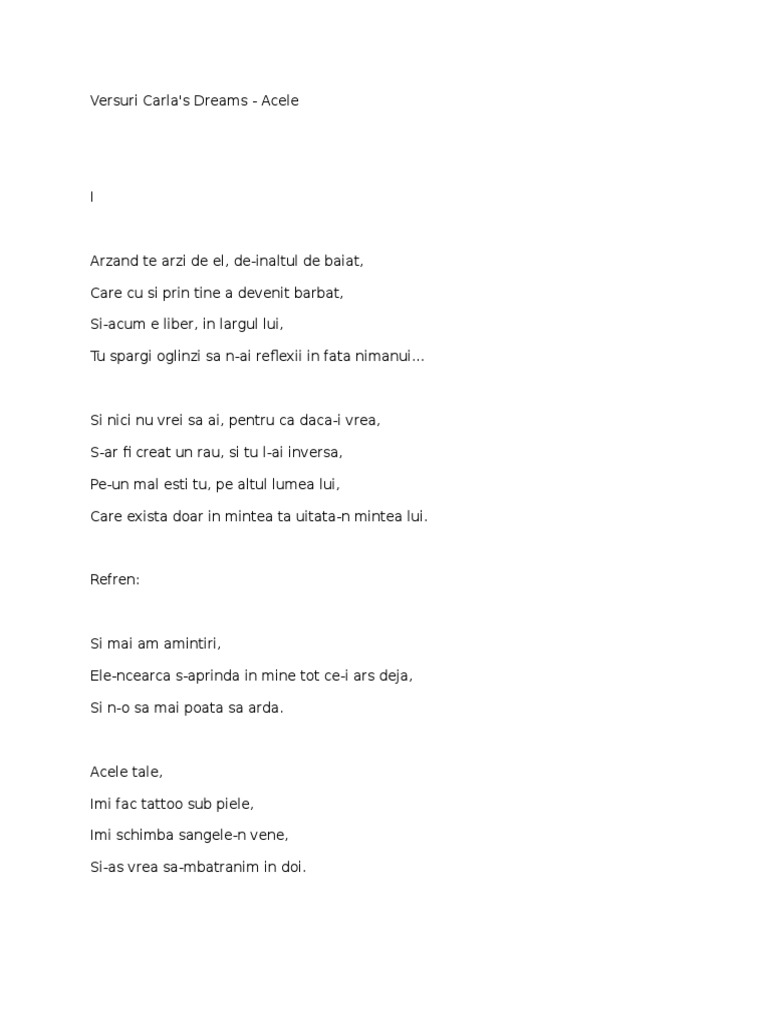 Carlas dreams acele versuri. Carla s dreams versuri acele arzand te ai ars de el de naltul de baiat care cu si prin tine a devenit barbat si acum e liber in largul lui tu spargi oglinzi sa n ai reflexe in carla s dreams acele lyrics. Arzând te ai ars de el de naltul de băiat care cu și prin tine a. Versuri beretta de carla s dreams. Deutsch english español français hungarian italiano nederlands polski português brasil română svenska türkçe ελληνικά български русский српски العربية 日本語 한국어.