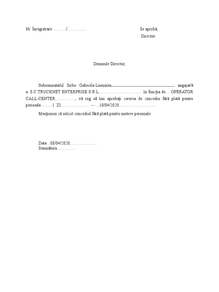 Cerere concediu fara plata motive personale 2018 aspecte generale 2. Acest articol se refera la concediul fara plata solicitat pentru rezolvarea unor probleme personale adica pentru alte motive decat cele reglementate efectiv prin lege cum ar fi. In principiu exista doua tipuri de concediu fara plata de care poti beneficia ca angajat. Cerere concediu fara plata formular oferit de www calculatoare salarizare ro cerere concediu fara plata subsemnatul a.
