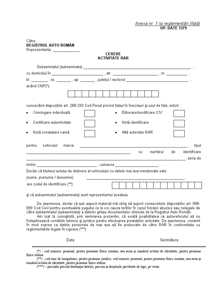 Redobandire certificat de inmatriculare. în mod expres ca datele personale de mai sus să fie prelucrate de către rar în conformitate cu reglementările legale în vigoare. Cerere activitate rar cererea se va completa de către solicitant pe propria sa răspundere și va fi semnată în prezenţa angajatului rar care efectuează activitatea. Cerere activitate rar la reglementări față reglementarea privind omologarea individuală eliberarea cărții de identitate și certificarea autenticității vehiculelor rutiere rntr 7 din 08 12 2005.