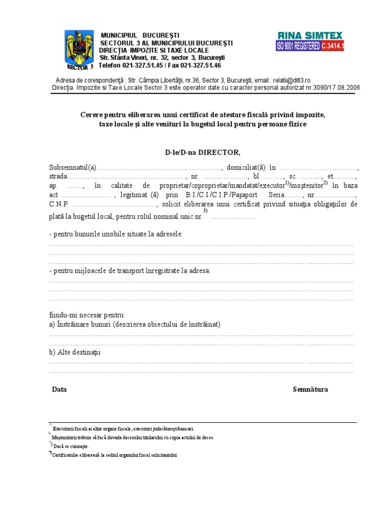 Certificat de atestare fiscala sector 3 persoane fizice. Sfanta vineri nr 32 sector 3 bucuresti. Declaratie fiscala pentru stabilirea taxei pentru afisaj in scop de reclama si publicitate descarca formular itl015 2016. Cerere privind scutirea de la plata impozitului pe cladiri terenuri si sau mijloace de transport pentru persoane fizice. Cerere tip cererea trebuie sa contina toate informatiile solicitate de formular.