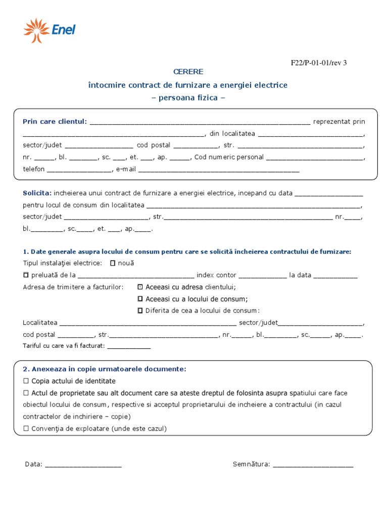 încheie un contract online adancescu 2020 05 10t14 09 10 00 00 încheie un contract online vă rugăm să selectați tipul de client pentru care doriți să contractați serviciile electrica furnizare s a. Schimbarea titularului unui contract de furnizare se face în situaţiile schimbării parţiale sau totale a identităţii clientului preluării prin cumpărare moştenire donaţie a unei locuințe sau a unui spațiu deja racordat la energie electrică fără a fi necesare modificări ale instalației electrice existente documentele necesare. Index contor citit la zi necesar. F22 p 01 01 rev 3 cerere încheiere contract de furnizare a energiei electrice persoană fizică subsemnatul a.