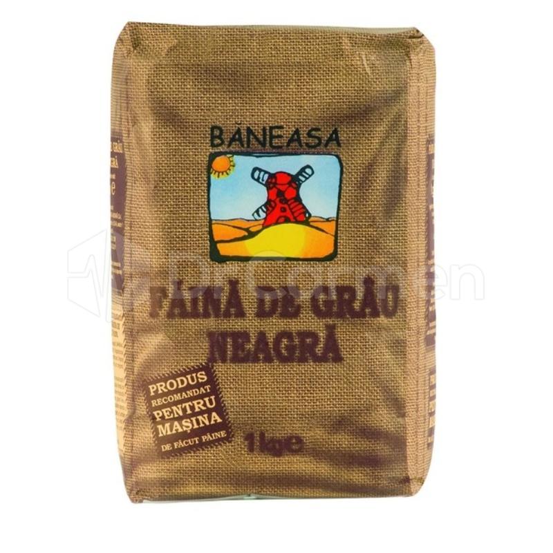 Faina din grau neagra obtinuta din grau pentru panificatie prin macinare dupa o prealabila curatire. Faina neagra de grau. Faina de grau. Faina de grau neagra baneasa 1 kg.