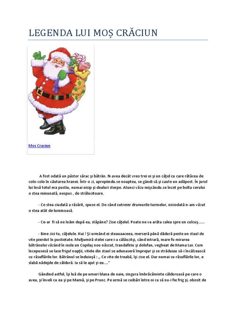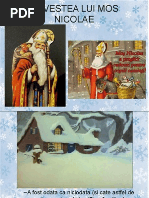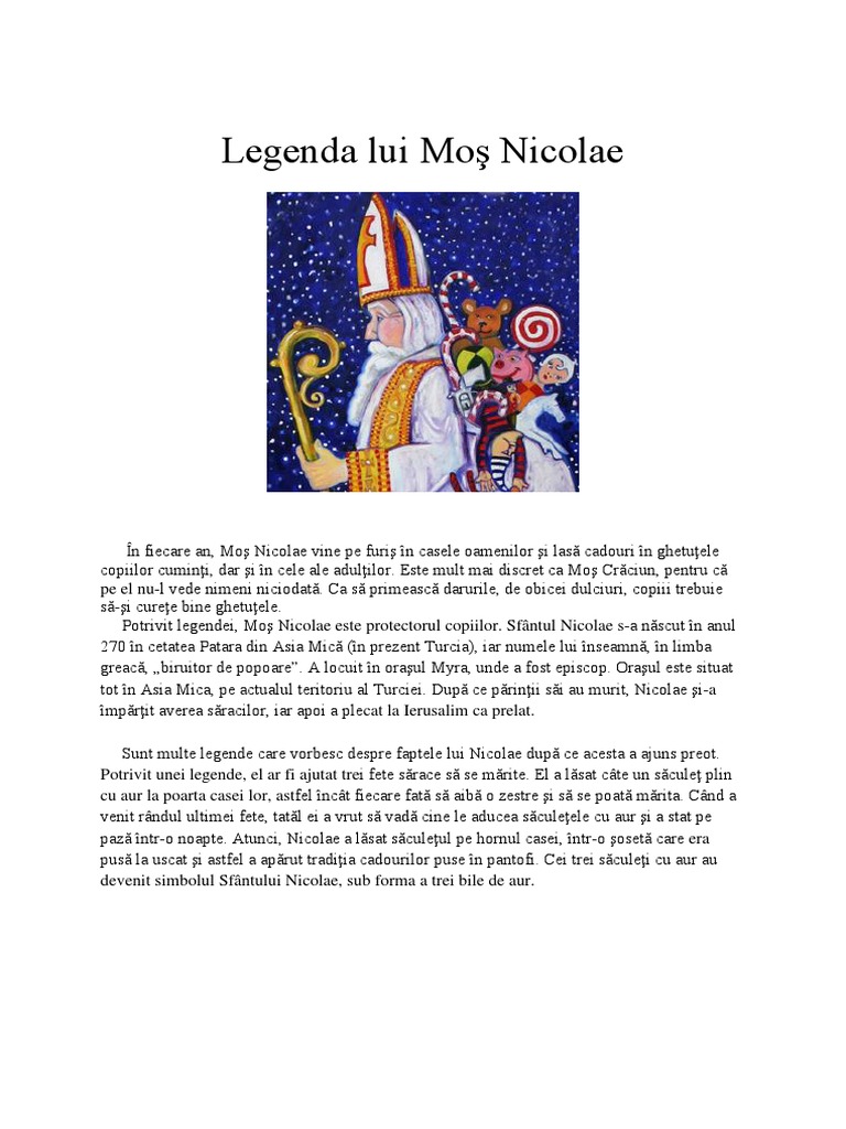 Legenda lui mos nicolae pdf. încă de mic nicolae s a remarcat prin credinţa bunătatea şi dragostea pentru semenii săi în special pentru copii înfăptuind multe lucruri extraordinare adevărate miracole. Legenda lui mos nicolae este una demna de prezentat relatat si inspirat insa putini cunosc intreaga legenda ce sta in spatele personajului cine a fost cum a fost viata lui ce fapte a savarsit cum a ajuns sa fie responsabil cu oferirea cadourilor si multe altele. Nicolae copiii cuminți diminiață când se trezesc găsesc în cizmulițele curate și frumos aranjate la ușă dulciuri și jucării iar cei răi nuelușe. Sfântul nicolae a trăit în secolele ii iii d hr iar data de 6 decembrie celebrată astăzi este data morţii sale în anul 352.