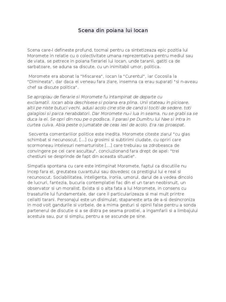Poiana lui iocan morometii. Poiana lui iocan morometii adunarile cele mai zgomotoase moromete emite niste judecati simple deschis care l fac ascultat de toata lumea. Scena care l defineste profund tocmai pentru ca sintetizeaza epic pozitia lui moromete in relatie cu o colectivitate umana reprezentativa pentru mediul sau de viata se petrece in poiana fierariei lui iocan unde taranii gatiti ca de sarbatoare se aduna sa discute cu un inimitabil umor politica. Volumul al ii lea trebuai sa faca fata primului carea a fost primit atat de bine. Agora sătească reminiscență a sfatului bătrânilor sau mini parlament bășcălios axă orizontală a satului după cum salcâmul e axa verticală poiana este un topos care va reveni în opera lui marin preda în travesti și după moromeții.